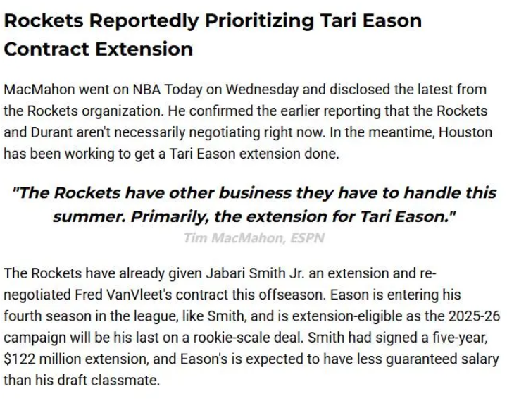 蒂姆-麦克马洪说道:火箭未必正在跟杜兰特谈续约,但休斯顿一直都在极力促成与塔里-伊森的提前续约。火箭队今夏余下最重要的事务是提前续约伊森,因为伊森的提前续约需要在10月26日前完成,而杜兰特的续约可以推迟到明夏6月30日。
