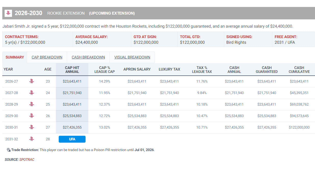 小贾巴里-史密斯这份五年1.22亿的提前续约中没有球员选项、没有球队选项但也是全额保障,均薪一年2440万。