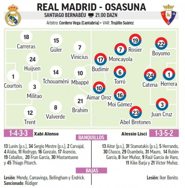 8月19日讯 北京时间明天凌晨3点,皇马将在西甲首轮比赛中主场对阵奥萨苏纳。西班牙媒体《马卡报》预测了皇马此役的首发阵容,姆巴佩、维尼修斯、迪亚斯组成三叉戟。